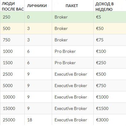 При пассивном участии, никого не приглашая, пристатусе BROKER, Ваши расходы составят 95 €, Вы получаете:- 50 WFO на баланс. Они будут доступны к выводу через 30 дней- 5 € каждую неделю, как только после Вас в компанию зарегистрируются 250 человек (как правило это происходит в первые 1-2 часа)При том же статусе, но пригласив 3 партнера, Вы получаете дополнительно:- 150 WFO на баланс. Они будут доступны к выводу через 30 дней- 75 € каждую неделю, как только после Вас в компанию зарегистрируются 750 человек (как правило это происходит в первые сутки)- 10% от дохода ваших приглашенных- доход по бинаруПри статусе PRO BROKER, пригласив 6 партнеров, вы получаете:- 600 WFO на баланс. Они будут доступны к выводу через 30 дней- 250€ каждую неделю, как только после вас в компанию зарегистрируются 1500 человек (как правило это происходит в течении 2-х дней)- 20% от дохода ваших приглашенных- доход по бинаруПри статусе EXECUTIVE BROKER, пригласив 9 партнеров, вы получаете:- 1 650 WFO на баланс. Они будут доступны к выводу через 30 дней- 1 500 € каждую неделю, как только после вас в компанию зарегистрируются 15000 человек (предположительно в течении 1-2-х недель)- 20% от дохода ваших приглашенных- 10% от дохода их структуры- доход по бинаруПри статусе EXECUTIVE BROKER, пригласив 18 партнеров, Вы получаете:- 2 100 WFO на баланс. Они будут доступны к выводу через 30 дней- 3 000 € каждую неделю, как только после вас в компанию зарегистрируются 25000 человек (предположительно в течении 2-х недель)- 20% от дохода ваших приглашенных- 10% от дохода их структуры- доход по бинаруГорячая линия SKYPE - VNOVOSTY![]()